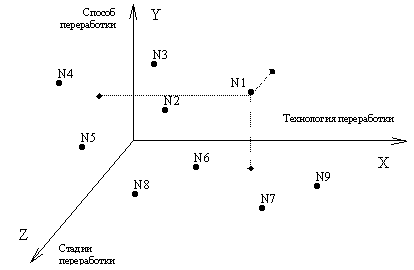 Удобно характеризовать каждую номенклатурную позицию в условной системе координат, отражающих эти признаки. Пусть вертикальная ось Z отражает положение продукта в ряду последовательных переделов продукции, горизонтальные оси характеризуют соответственно технологические и потребительские особенности продукта.
