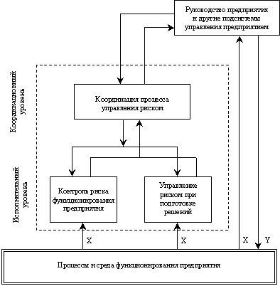 На координирующем уровне выполняются командно-контрольные процедуры согласования работы всех звеньев подсистемы управления риском в соответствии с принятыми целевыми установками предприятия. Человеко-машинные процедуры управления риском необходимо организовать, т.е. указать сроки проведения работ, форму и объем представления результатов, задать состав и порядок выполнения процедур анализа и оценки уровня риска, подготовить необходимую нормативную и справочную информацию, собрать текущую информацию, запустить процесс разработки мероприятий по снижению уровня риска и, наконец, довести выработанные предложения до сведения руководства предприятия, а после их утверждения организовать реализацию антирисковых мероприятий. Эта совокупность действий входит в состав функции «координация процесса управления риском».