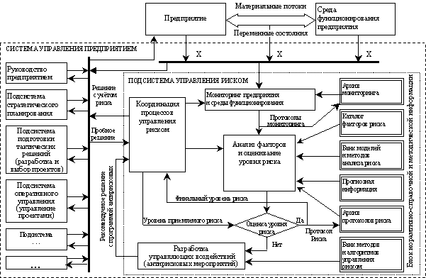 Подсистема управления риском, как и всякая человеко-машинная система, состоит из объекта и субъекта управления. В качестве управляемого объекта здесь выступает предприятие, его экономические отношения с другими хозяйствующими агентами, рабочие и служащие предприятия, действующие на предприятии технологические процессы и информационные потоки. Управляемой переменной является расчетная величина – уровень риска. Управляющая часть, или субъект управления, в этой подсистеме – специальная группа людей (подразделение или сотрудник предприятия, пользующийся услугами профессиональных консультантов), которая на основе полученной информации, используя различные методы теории риска, разрабатывает мероприятия – управляющие воздействия – для снижения уровня риска или удержания его в допустимых пределах.