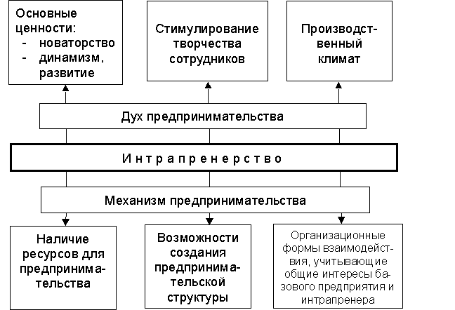 В теоретических исследованиях [2] уделяется внимание не только предпринимательству как способу ведения дел на самостоятельной независимой основе, но и внутрифирменному предпринимательству, или интрапренерству [3] . Появление интрапренерства прежде всего связано с переходом многих крупных производственных структур на предпринимательскую форму организации производства.