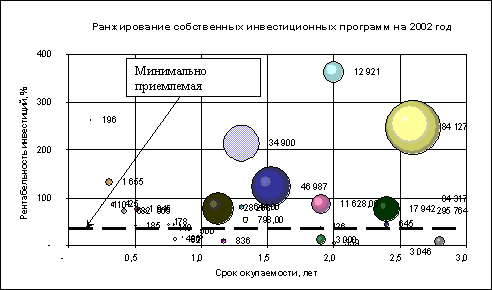 Третья проблема - сложность ранжирования и выбора при большом количестве проектов, предлагаемых для финансирования. Ниже приведен график, призванный несколько упростить работу экспертов. Разработана также методика интегральной оценки проектов.