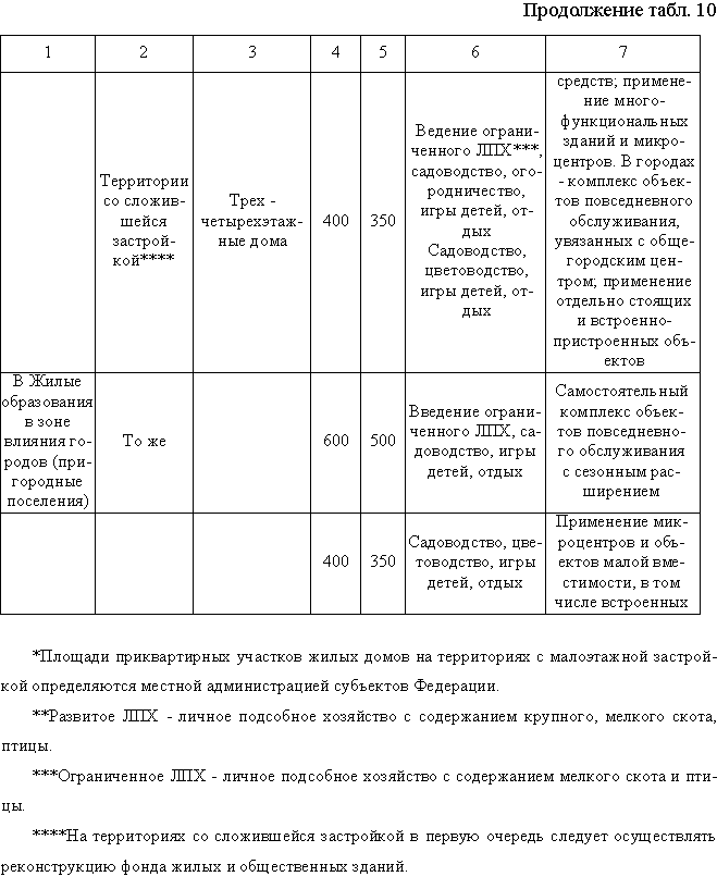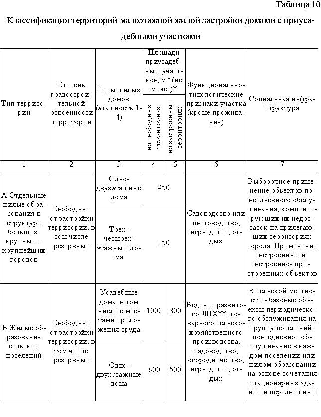 Классифицировать территории малоэтажного жилищного строительства следует в соответствии с табл. 10.
