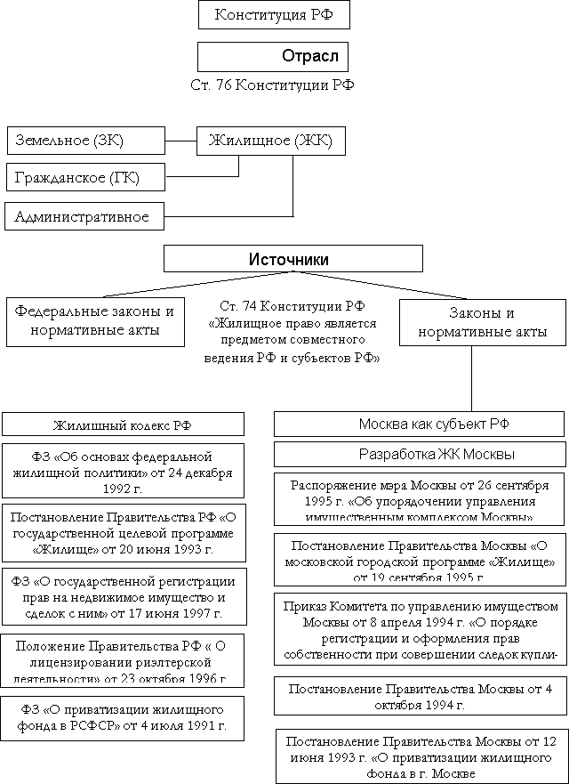 Жилищный кодекс (ЖК), другие федеральные законы регламентируют жилищные отношения, которые согласно ст. 72 Конституции РФ являются предметом совместного ведения РФ и субъектов РФ. Поэтому ЖК и федеральные законы выступают одновременно в качестве правовой базы, на основе которой принимаются законы и иные нормативные правовые акты субъектов РФ. Исходя из конституционных положений, законодательство в РФ в сфере недвижимости развивается как сложная система, в которой в качестве системообразующих законов выступают Конституция РФ, федеральные законы (например, «Об основах федеральной жилищной политики», «О приватизации жилищного фонда в Российской Федерации»), Жилищный кодекс РФ и другие акты.