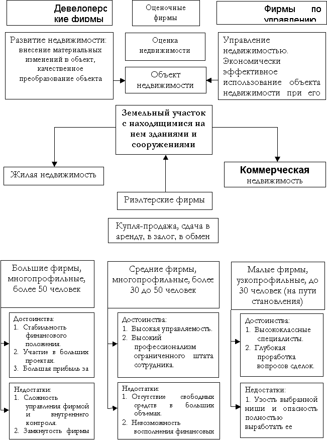 В современных предпринимательских фирмах создаются профессионально-предпринимательские группы, такие, как ипотечные, страховые компании по страхованию титула, консультанты по операциям с недвижимостью и т.д. каждая из этих групп выполняет свои функции, а в рамках одной фирмы могут быть разные направления деятельности. Например, девелоперская деятельность и деятельность по управлению недвижимостью достаточно часто пересекаются, особенно на рынке коммерческой недвижимости.