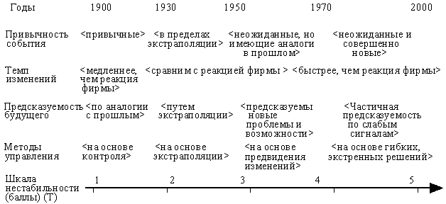Мы видим, что основная тенденция развития мирового рынка состоит в непрерывном увеличении его изменчивости и нестабильности. Недаром в качестве некой обобщенной меры состояния рынка на диаграмме приведена шкала нестабильности в баллах, где большее количество баллов соответствует повышению уровня нестабильности. Эта шкала приведена здесь в связи с тем, что и сегодня ряд предприятий и отраслей могут работать в условиях относительной стабильности (газовая, нефтяная, лесная промышленность - индекс 1-2), а другие - в обстановке большой нестабильности (радиотехническая, автомобильная, соответствующий индекс 4-5).