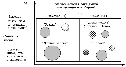 Каждая СЗХ определяется кругом в этих координатах, причем площадь круга соответствует объему продаж в СЗХ или относительной доле СЗХ в продажах всей фирмы.