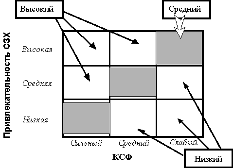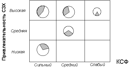 Пионером в разработке усовершенствованной матрицы стратегического портфеля СЗХ фирмы с переменными привлекательность СЗХ- КСФ является фирма «Дженерал электрик» (в сотрудничестве с консультативной фирмой Mc Kinsey). Эта матрица имеет размерность 3x3. В ней площади кругов, отображающие СЗХ, пропорциональны объемам продаж в них, а заштрихованные секторы показывают долю рынка, контролируемую фирмой (рис. 52).