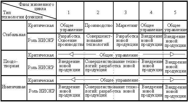 В зависимости от типа технологии в разных фазах жизненного цикла продукта определяются критические сферы управления фирмой, а также меняется роль сферы НИОКР. Это иллюстрировано табл. 15.1.