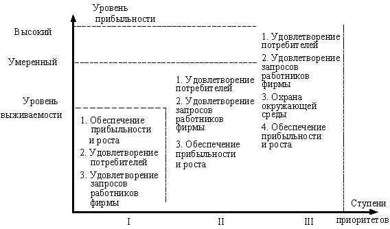 Хотя среди целей получение прибыли имеет ключевое значение, однако приоритеты целей могут определяться и уровнем прибыльности фирмы (рис. 62).