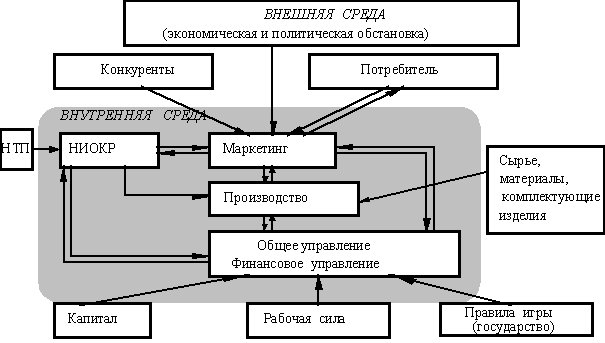 Рис. 4. Основные информационные и материальные потоки во внешней и внутренней сферах фирмы (НТП - научно-технический прогресс)