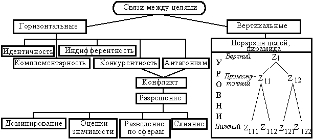 Как правило, цель ставится не одна, а в группе с многими другими (система целей). Соответственно возникает проблема их взаимодействия на одном уровне (горизонтальные связи) и по иерархии (вертикальные).