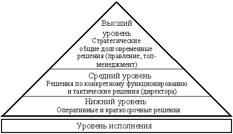 Иерархия управления - инструмент для реализации целей фирмы и гарантия сохранения системы. Чем выше иерархический уровень, тем больше объем и комплексность выполняемых функций, ответственность, доля стратегических решений и доступ к информации. Одновременно растут и требования к квалификации и личная свобода в управлении. Чем ниже уровень, тем больше простота решений, доля оперативных видов деятельности (рис.12).