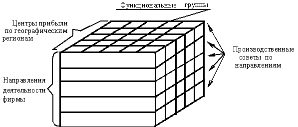 Для предприятий (фирм), действующих на международном рынке, может применяться трехмерная (тензорная) структура управления: изделие - регион - функция.