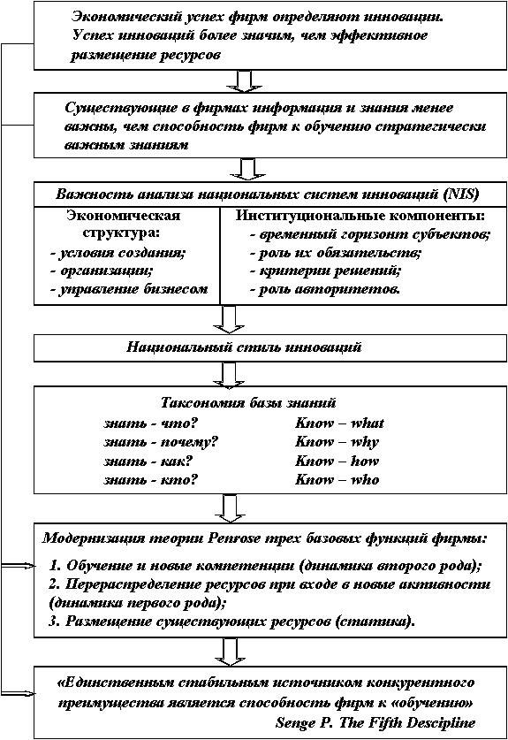 В соответствии с теорией фирмы Е. Пенроуз [11] компетентность менеджмента и человеческие ресурсы контролируют пределы роста фирмы. В этом случае рост компетенции менеджмента становится стратегической целью и справедливо утверждение: “Единственным устойчивым источником конкуретного преимущества является способность к “обучению” [12].