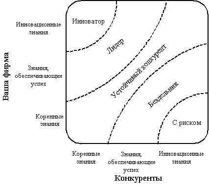 Знания, обеспечивающие успех, снабжают фирму конкурентным потенциалом. Фирма может иметь в общем тот же самый уровень, кругозор или качество знаний, что и ее конкуренты, а специфические знания могут помочь ей использовать стратегию дифференциации [4]. Эти фирмы могут выбрать конкуренцию по знаниям в сходной конкурентной позиции, надеясь, что они знают больше конкурентов.