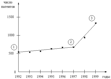 Исследование трендов патентной активности фирм в 1992--1999 гг. выявило один основной эффект. Тренды четко делятся на две области во времени: 1992--1997 гг. и 1997--1999 гг. В 1997 г. наблюдается резкий рост патентной активности. Типичный тренд патентной активности фирмы Siemens приведен на рис. 14.