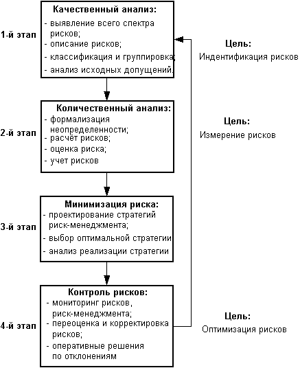 Итак, значение любого риска для каждого участника индивидуально, а общий риск инновационного проекта есть сложная система частных (в том числе индивидуальных) рисков со сложными многочисленными связями. Система риск-менеджмента инновационного проекта должна содержать стадии в соответствии с рис. 16 [38, 39, 40].