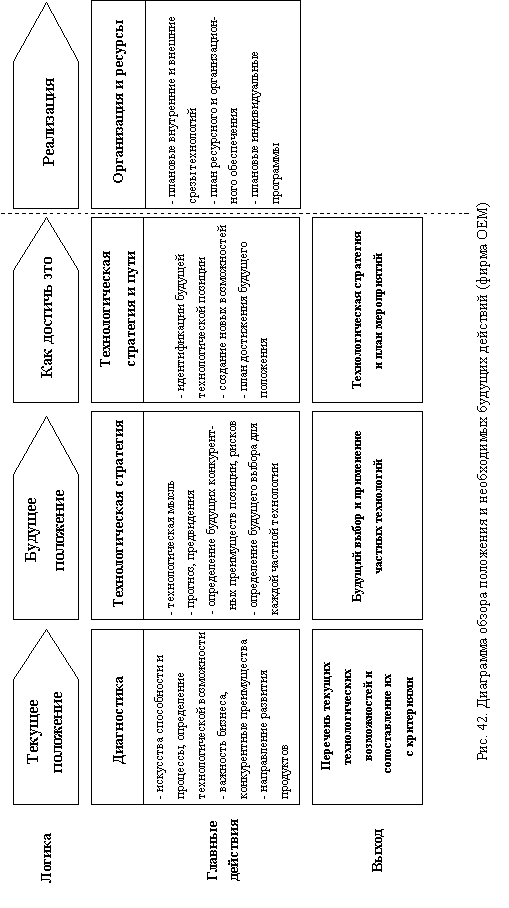 «Действия» как часть бизнес-процесса (рис. 41) должны быть определены, исходя из оценки сегодняшнего положения, желаемой будущей позиции, оценки требуемых мероприятий. На рис. 42 приведена диаграмма, используемая фирмой OEM для описания действий по объективной оценке текущего положения и разработке технологической стратегии.