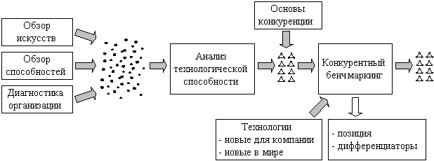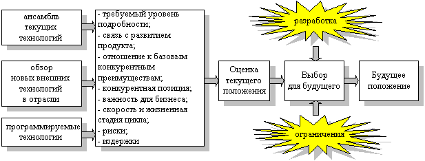 Этот процесс обзора должен включать те технологии, которые полностью меняют правила игры на рынке и, следовательно, радикально изменяют базис конкуренций. Сбор информации о технологических возможностях вне компании в форме искусств, организованных улучшений и т.д. возможно позволит ликвидировать бреши. Такой процесс оценки будущих возможностей показан на рис. 44.