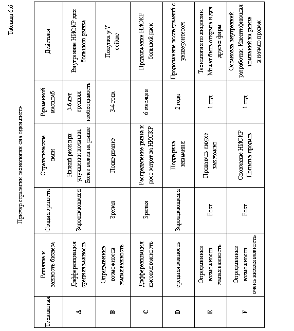Финальным выходом может являться технологическая стратегия «на одном листе» с приложением маршрутов для каждой технологии и существенной информации о том, какие новые технологии повлияют на решение потребителя о покупке. Пример такой технологической стратегии для электронной компании показан в табл. 6.6. Компании обычно быстро конвертируют технологические стратегии «на одном листе» в то, что легко понять, компилировать и реально сделать.