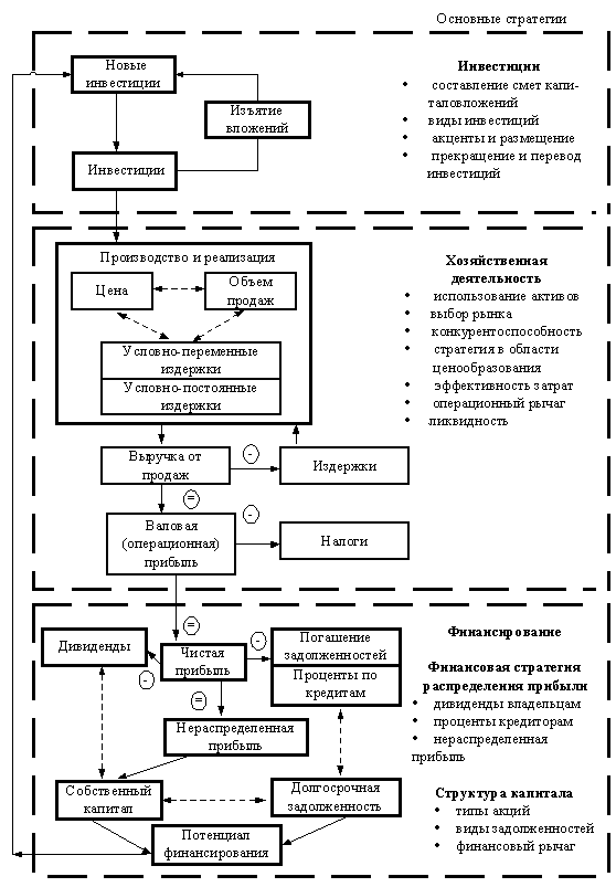 В финансовой сфере деятельности производится распределение этой прибыли между владельцами (дивиденды), кредиторами (проценты). Оставшаяся прибыль реинвестируется для развития производства и вместе с долгосрочной задолженностью составляет потенциал финансирования предприятия, который в виде новых инвестиций вновь поступает в хозяйственную деятельность.