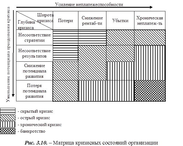 Для идентификации стадии кризисного процесса построена матрица кризисных состояний организации (см. Рис. 3.10), характеризующая кризис по глубине и широте охвата.