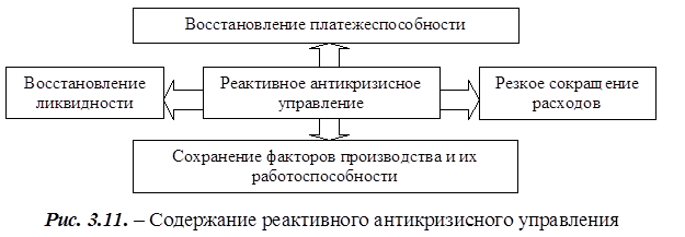 «Реактивное антикризисное управление» направлено на выполнение таких конкретных задач, как восстановление достаточного уровня ликвидности, платежеспособности. Оно реализуется на стадии острого кризиса в условиях острой нехватки времени, что существенно усложняет разработку взвешенной антикризисной концепции, а также переосмысление прежних целей и норм. «Реактивное антикризисное управление» можно охарактеризовать как планирование и внедрение, целью которых, как правило, является стремление к восстановлению прежнего, докризисного состояния (Рис. 3.11).