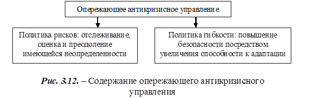 - антикризисное управление с целью предвидения кризисов, управления на ранних этапах развития кризиса и профилактики возникновения кризисных ситуаций – «априорное (опережающее) антикризисное управление»[98].