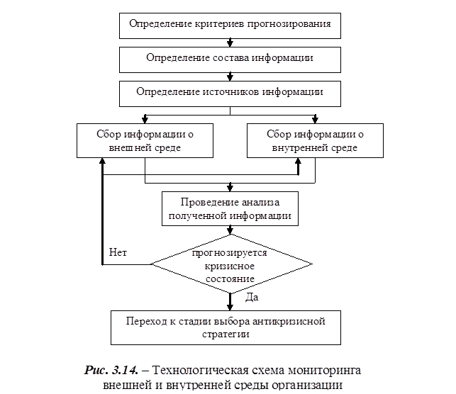 Одним из важнейших этапов антикризисного управления, является этап стратегического анализа. Мониторинг должен составлять неотъемлемую часть этого процесса и осуществляться непрерывно. Технологическая схема мониторинга представлена на Рис. 3.14.