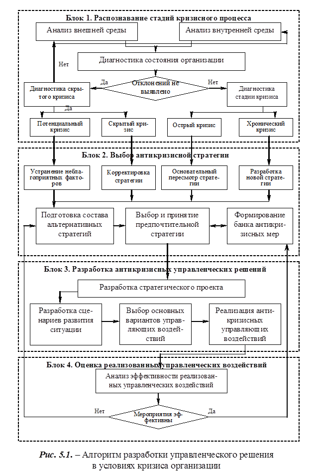 На рисунке 5.1. представлен детализированный по стадиям кризисного процесса алгоритм разработки управленческого решения в условиях кризиса организации, включающий в себя следующие блоки: блок распознавания стадий кризисного процесса; блок выбора антикризисной стратегии в соответствии со стадией кризиса; блок выработки соответствующих антикризисных управленческих решений и блок оценки реализованных управленческих воздействий.