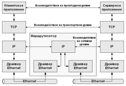 На рис. 2.3 показано, как осуществляется взаимодействие двух компьютеров из разных сетей с использованием стека протоколов TCP/IP. Программное обеспечение IP-протокола с помощью маршрутизатора передает пакеты из одной сети Ethernet в другую. Протоколы верхних уровней, прикладного и транспортного, осуществляют соединения между компьютерами, клиентом и сервером приложения, в то время как IP обеспечивает связь между конечной и промежуточной системами.
