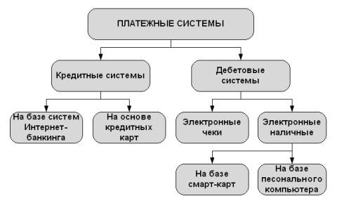 · Основной движущей силой развития Интернета в качестве глобального электронного рынка служат электронные платежные системы, делающие возможным проведение расчетов между финансовыми, коммерческими организациями и пользователями Интернета в процессе покупки/продажи товаров и услуг через него. Платежные системы делятся на два основных направления: кредитные системы и дебетовые системы.