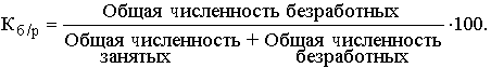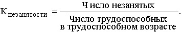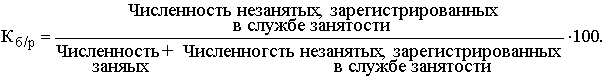 При таком подходе игнорируется рыночный характер движения рабочей силы, когда на занятость влияют спрос и предложение. Часть трудоспособного населения по разным причинам спроса на рабочие места не предъявляет, а поэтому на рынок труда не выходит (домохозяйки, учащаяся молодежь. граждане, имеющие нетрудовые источники дохода, и другие категории населения). В мировой практике коэффициент безработицы рассчитывается по следующей формуле: