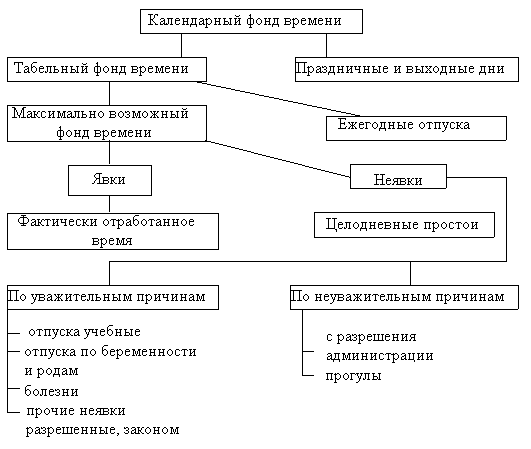 Показатель календарного фонда времени отражает рабочее и внерабочее время, т.е. число человеко-дней явок и неявок на работу.