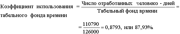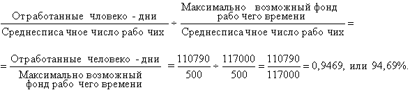 б) путем деления числа фактически отработанных человеко-часов на максимально возможный фонд рабочего времени в человеко-часах. Последний можно получить, перемножив величину этого фонда в человеко-днях на среднюю установленную продолжительность рабочего дня: