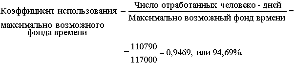 Коэффициент использования максимально возможного фонда рабочего времени характеризует степень фактического использования того времени, которое максимально могли отработать рабочие предприятия. Неиспользованное рабочее время на предприятии составило 5,31% (100%-94,69%). Это время, не отработанное по уважительным причинам (отпуска учебные и в связи с родами, дни болезни и неявок, разрешенных законом), а также потери рабочего времени (простои, неявки с разрешения администрации, прогулы).