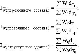 Для анализа изменения средней выработки под влиянием ряда факторов используется система индексов средних величин или система агрегатных индексов, в которых в качестве индексируемой величины выступает уровень производительности труда отдельных единиц совокупности, а в качестве весов – количество (в абсолютном выражении) таких единиц с разным уровнем производительности труда или их удельный вес в общей численности (dт):