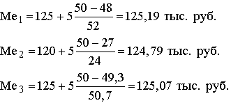 Таким образом, у половины предприятий уровень себестоимость единицы продукции превышает 125,19 тыс. руб., половина всего объема продукции производится с уровнем затрат на изделие больше 124,79 тыс. руб. и 50 % общей суммы затрат образуется при уровне себестоимости одного изделия выше 125,07 тыс. руб. Заметим также, что наблюдается некоторая тенденция к росту себестоимости, так как Ме2 = 124,79 тыс. руб., а средний уровень равен 123,15 тыс. руб.