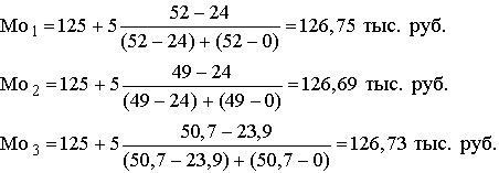 Для нашего примера можно рассчитать три модальных значения исходя из признаков числа предприятий, объема продукции и суммы затрат. Во всех трех случаях модальный интервал один и тот же, так как для одного и того же интервала оказываются наибольшими и число предприятий, и объем продукции, и общая сумма затрат на производство: