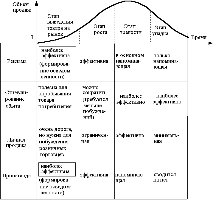 Рис. 11.5. Эффективность средств стимулирования на различных этапах жизненного цикла товара