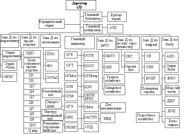 В промышленном производстве наиболее широкое распространение получила линейно-функциональная организационная структура управления. Линейные руководители при ней являются единоначальниками и полностью отвечают за работу подразделения (директор, зам. директора по производству, начальник цеха, начальник участка, старший мастер, мастер, бригадир). Функциональные руководители (главный инженер, главный экономист, главный бухгалтер и т.д.) составляют штаб директора и руководят функциональными службами (ОГК, ОГМ, ОГЭ и т.д.).