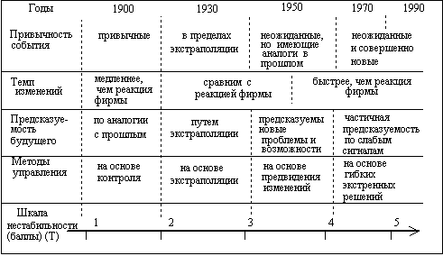 Мы видим, что основная тенденция развития мирового рынка состоит в непрерывном увеличении его изменчивости и нестабильности. Недаром в качестве некой обобщенной меры состояния рынка на диаграмме приведена шкала нестабильности в баллах, где большее количество баллов соответствует повышению уровня нестабильности. Эта шкала приведена здесь в связи с тем, что и сегодня ряд предприятий и отраслей могут работать в условиях относительной стабильности (газовая, нефтяная, лесная промышленность — индекс 2—2,5), а другие — в обстановке большой нестабильности (радиотехническая, автомобильная — соответствующий индекс 4—5).