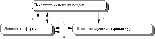 В лизинговой сделке участвуют 3 стороны (рис. 4.9): предприятие (поставщик основных фондов), лизинговая фирма (которая оплачивает), арендатор (который использует). 1 — лизинговая фирма заключает трехсторонний контракт (соглашение); 2 — поставка основных средств арендатору; 3 — лизинговая фирма оплачивает стоимость основных фондов поставщику; 4 — арендные платежи арендатора лизинговой фирме.
