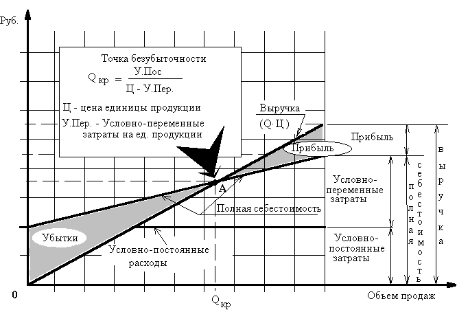Концепция "безубыточного ведения хозяйства" может быть выражена в простом вопросе: сколько единиц (Q) продукции необходимо продать в целях возмещения произведенных при этом условно-постоянных затрат (У.Пос).