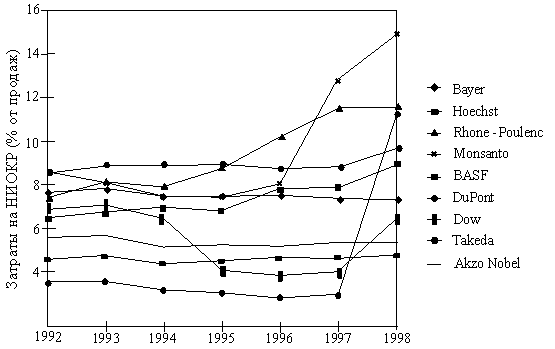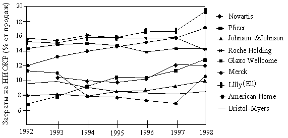 Графики относительных затрат на НИОКР к объемам продаж в 1992 – 1998 годах по тем же отраслям лидирующих глобальных компаний представлены в приложении 3. Типичные графики относительных затрат на НИОКР к объемам продаж в 1992 – 1998 годах крупнейших компаний представлены на рисунке 7 и 8.