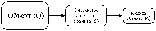 Как видно на рисунке 10, связь между объектом и его моделью носит опосредованный характер, поскольку между объектом и его моделью располагается системное описание объекта. При этом зазор между объектом и его системным описанием может быть весьма значительным. Например, в системном описании предприятия может быть на самом деле отражен лишь процесс производства продукции, в то время как процессы воспроизводства ресурсов не отражаются, поскольку находятся вне интересов исследователя. Логично считать, что если системное описание объекта S позволяет однозначно восстановить объект Q, то модель M, построенная на базе такого системного описания, можно назвать системной моделью объекта Q.
