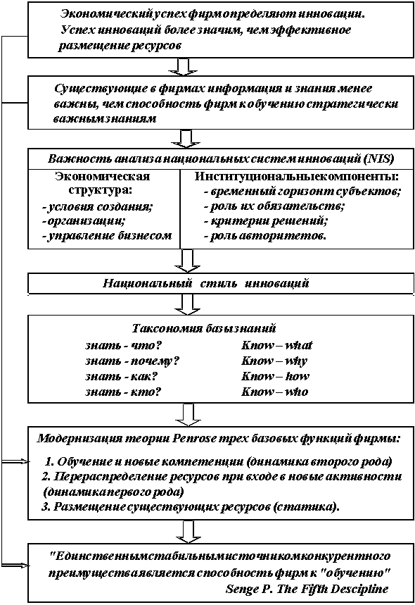 В соответствии с теорией фирмы Е. Пенроуз [16] компетентность менеджмента и человеческие ресурсы контролируют пределы роста фирмы. В этом случае рост компетенции менеджмента становится стратегической целью и справедливо утверждение: «Единственным устойчивым источником конкурентного преимущества является способность к «обучению» [17].