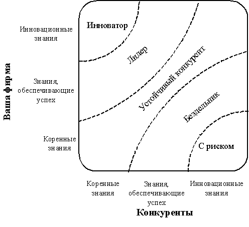 Знания, обеспечивающие успех, снабжают фирму конкурентным потенциалом. Фирма может иметь в общем тот же самый уровень, кругозор или качество знаний, что и ее конкуренты, а специфические знания могут помочь ей использовать стратегию дифференциации. Эти фирмы могут выбрать конкуренцию по знаниям в сходной конкурентной позиции, надеясь, что они знают больше конкурентов. Инновационные знания дают фирме возможность лидировать в отрасли. Они часто предоставляют фирме возможность изменить «правила игры» [21].