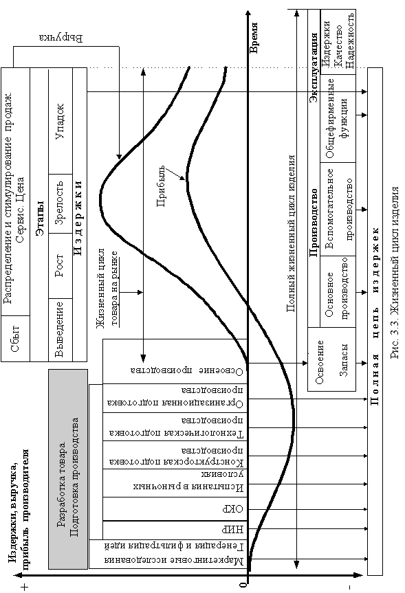 На рис. 3.3 приведен "финансовый профиль" проекта создания, освоения и производства нового изделия (жизненные циклы изделия и товара) в рамках многопродуктовой корпорации [4].