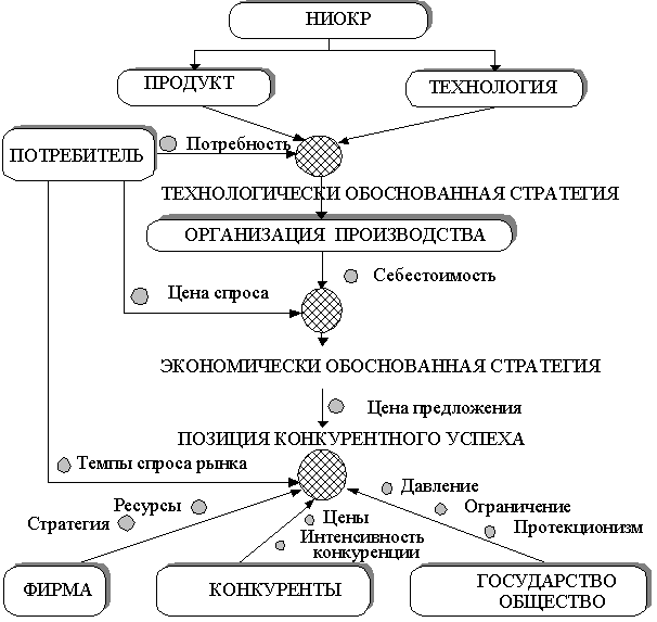 Начало процесса формирования конкурентного успеха фирмы в выведении на рынок нового продукта лежит в пересечении множеств решений маркетинговых и научно-технических. Наличие совместимых потребностей определенных рыночных сегментов и технологических возможностей их обеспечить создает фундамент технологически обоснованной стратегии. Однако это лишь начало. Технологически обоснованная стратегия может не привести к экономическому успеху, если у фирмы нет возможностей организовать производство с издержками, позволяющими использовать на рынке цены, совместимые с покупательной способностью населения. Далее позиция конкурентного успеха зависит от конкурентного статуса фирмы, ее ресурсов, стратегии и интенсивности конкурентных действий других фирм. Составляющие конкурентного статуса фирмы в НИОКР приведены в [5].